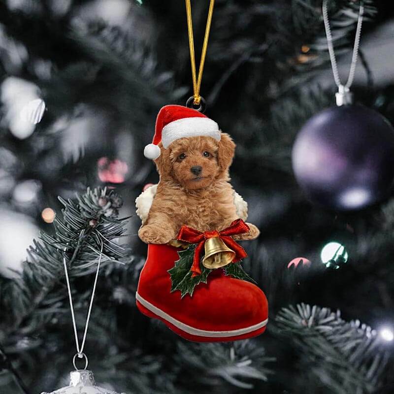 Brown Poodle In Santa Boot Christmas Hanging Ornament SB046