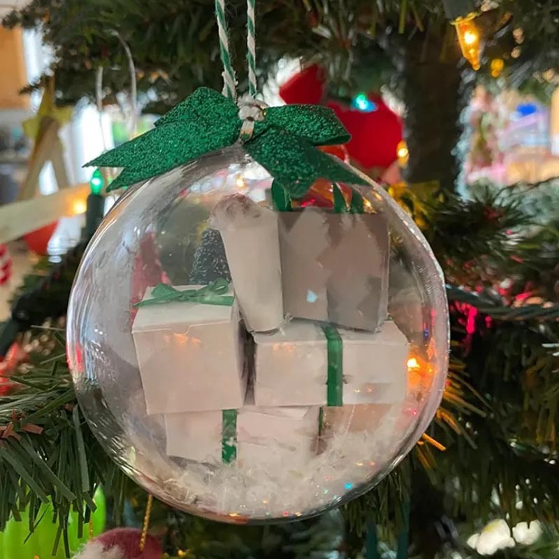 - Materials: Plastic Ornament, filled with Cardstock Boxes and Envelopes