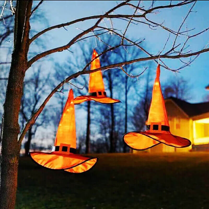 The perfect combination of Halloween witch hats and warm string lights make it is in a class by itself. It not only can be used as home decoration but also hangs on the tree, garage, eaves, porch, roof.